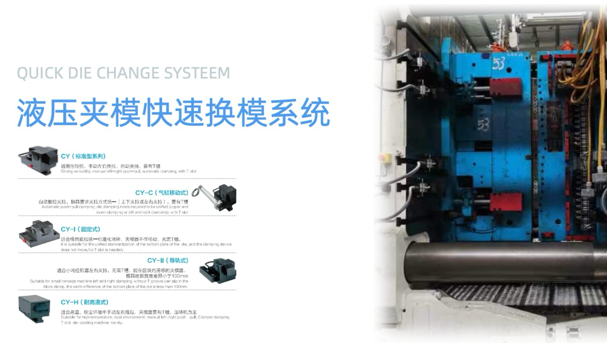 公司主要生產注塑機快速換模系統、壓鑄機快速換模系統、沖床快速換模系統、油壓機快速換模系統、合模機快速換模系統。 我公司努力研究、優化機器換模生產的自動化、省力化之各式快速換模系...